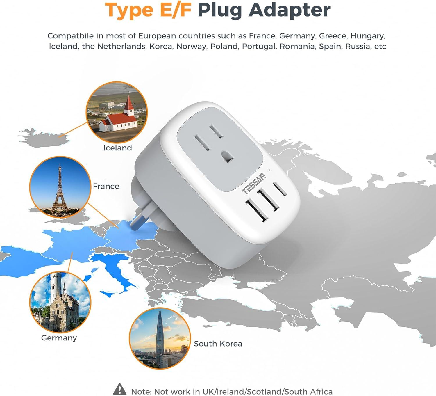 TESSAN Universal Travel Adapter PD 20W, Ultra Thin International Power Adapter with 2 USB C 1 USB A, White(Type E F-German Europe)