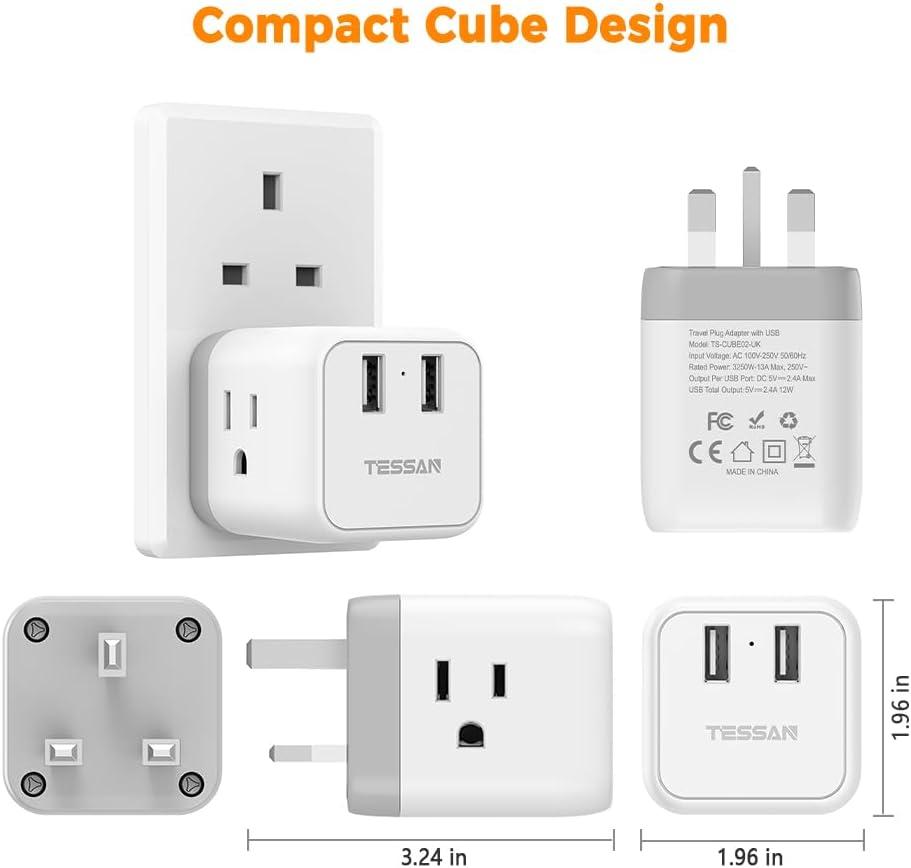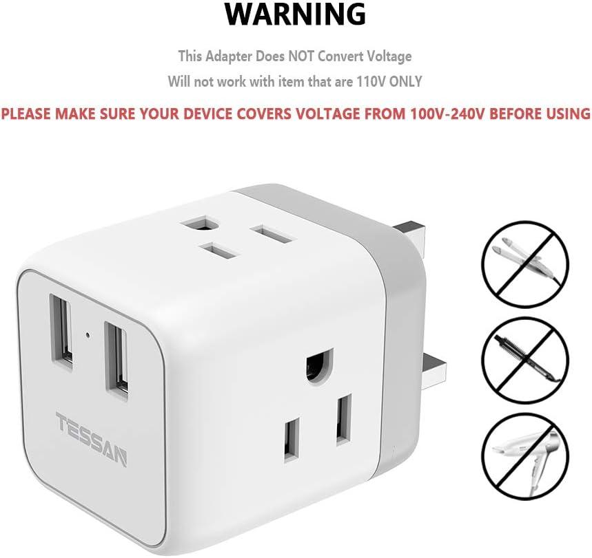 imageTESSAN US to UK Plug Adapter Type G UK Travel Plug Adapter Ireland Scotland Dubai Power Adaptor with 3 Outlets and 2 USB Ports USA to England London British Qatar Kenya Outletgrey white