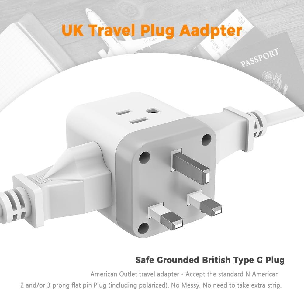 5 in 1 UK power adapter: This UK plug adapter can turn 1 UK Type G socket into 3 American outlets and 2 USB ports, charge up to 5 devices at a time without blocking; Ideal for traveler, business man and foreign student use in airports, hotels and dorm room