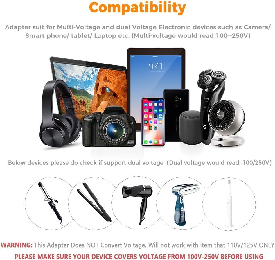 NOTE: This USA to UK plug adapter only works on 100V to 250V wide voltage devices; If you want to use your hair dryer, straightener or curling irons, they need to support wide voltage, or you may need a power voltage converter