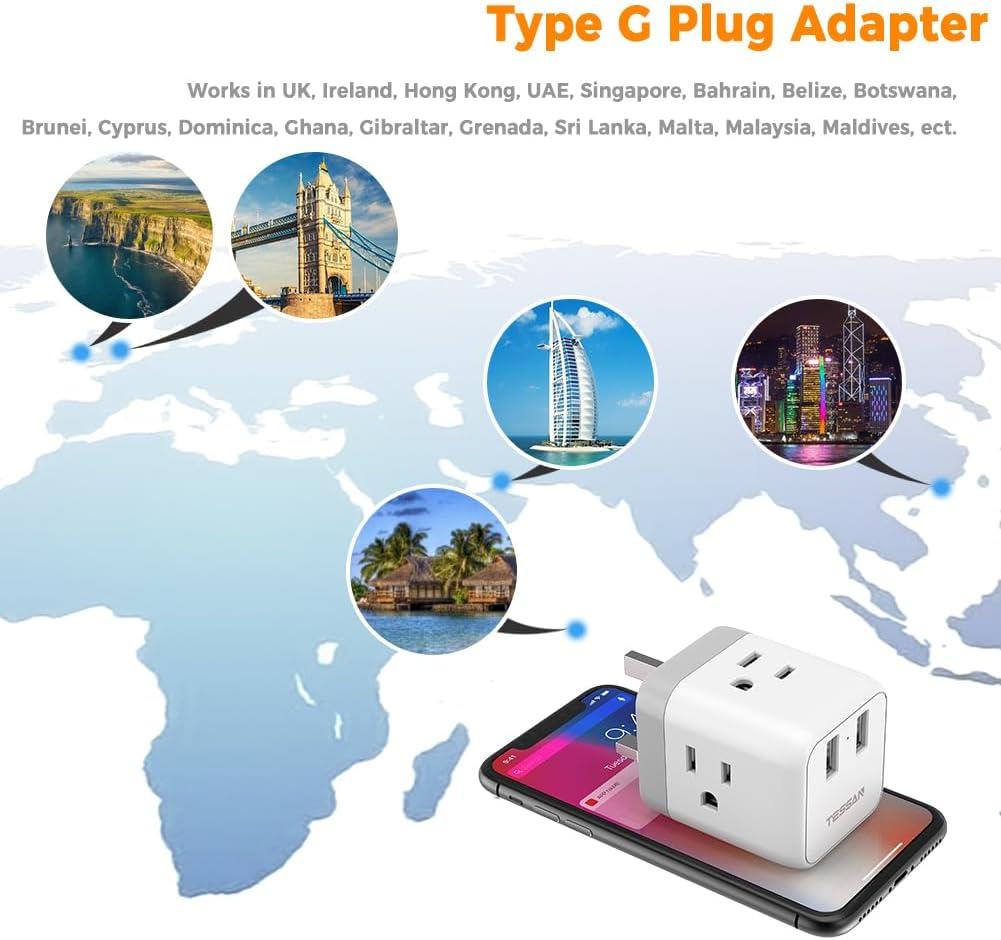 imageTESSAN US to UK Plug Adapter Type G UK Travel Plug Adapter Ireland Scotland Dubai Power Adaptor with 3 Outlets and 2 USB Ports USA to England London British Qatar Kenya Outletgraywhite