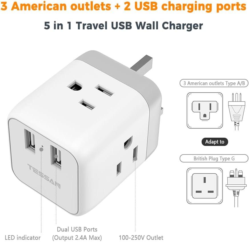 TESSAN US to UK Plug Adapter, Type G UK Travel Plug Adapter, Ireland Scotland Dubai Power Adaptor with 3 Outlets and 2 USB Ports, USA to England London British Qatar Kenya Outlet(gray-white)