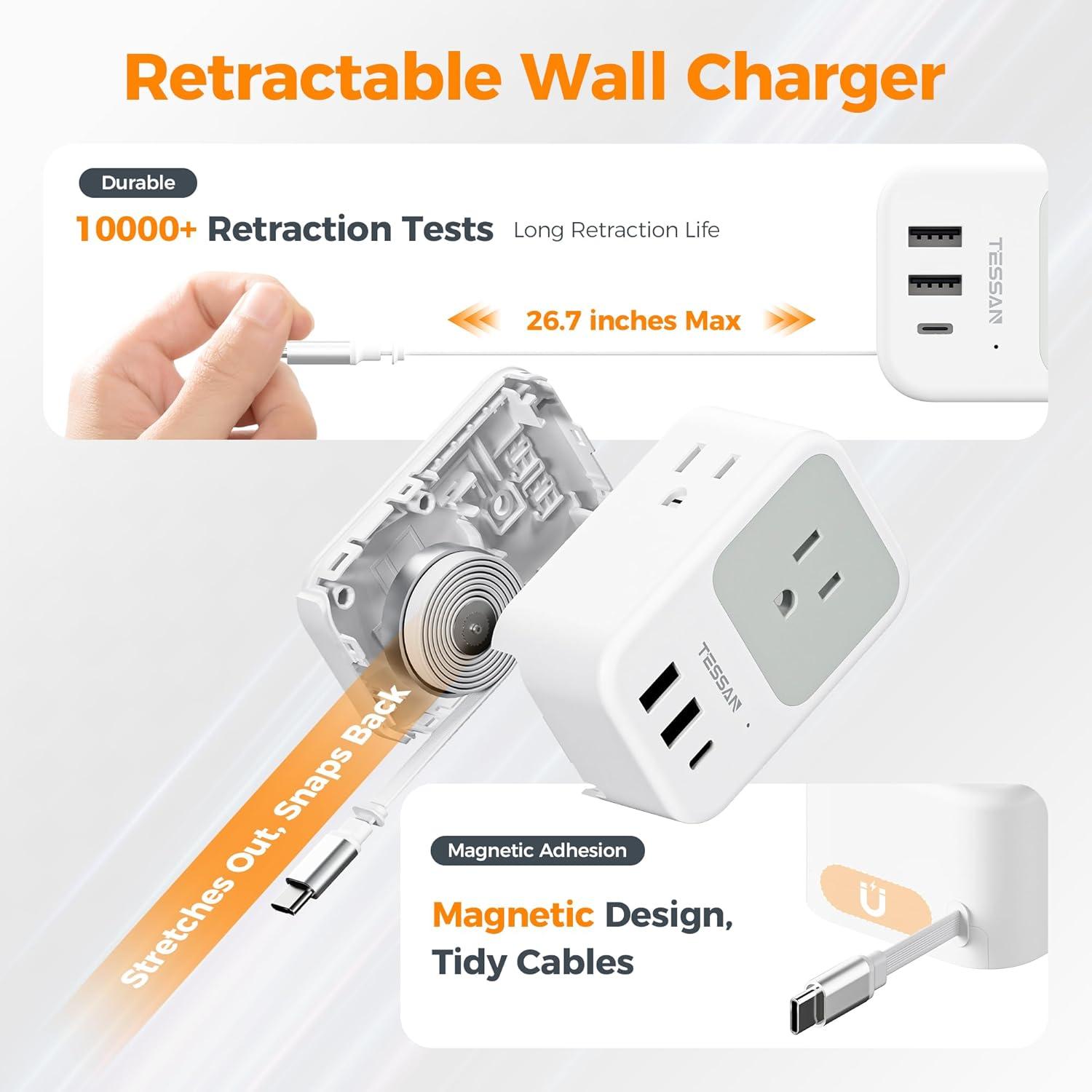 3 USB Ports and Retractable USB C Cable: The multi plug wall charger comes with 2 USB A ports feature 2.4A, 1 USB C port features 3A, plus a 20W retractable USB C cable; This all in one charging solution efficiently powers cellphones, tablets, cameras, and power banks, eliminating the need for extra cables