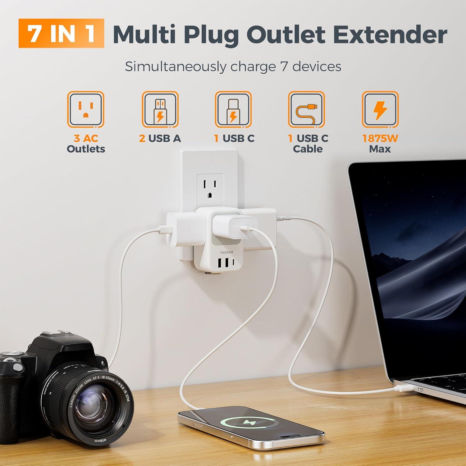 7 in 1 Multi Device Charging Station: This wall plug extender could turn 1 socket into 3 AC outlets and 4 USB ports; Charges up to 7 devices at the same time, perfect for powering phones, tablets, cameras and home appliances in office, dorm or living room