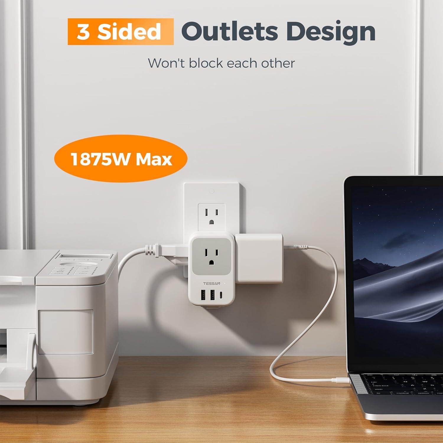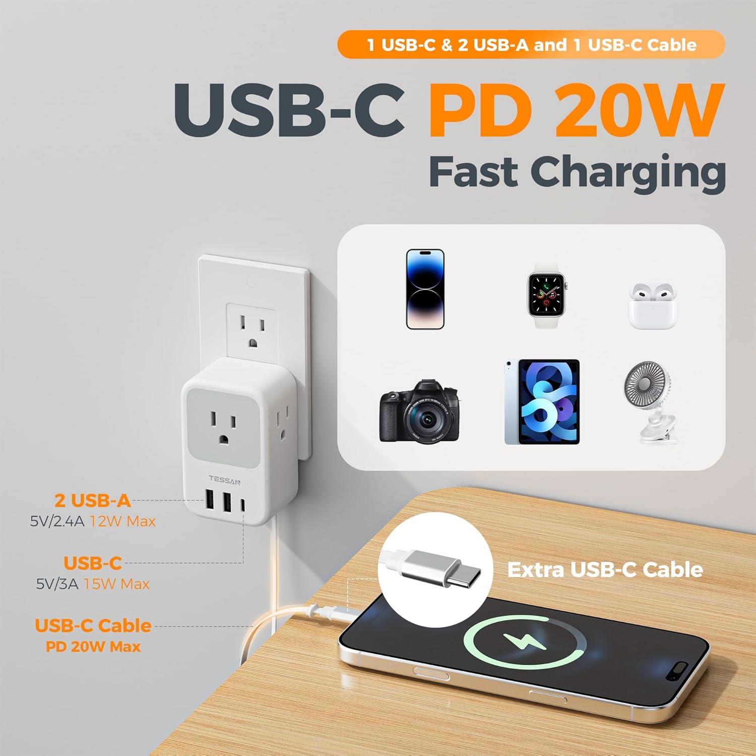 TESSAN USB C Charger Block, Multi Plug Wall Outlet Extender with 3 USB, Retractable USB-C Cable, 3 Side Multi Port Adapter for Cruise, Bathroom, Office, Dorm Essentials