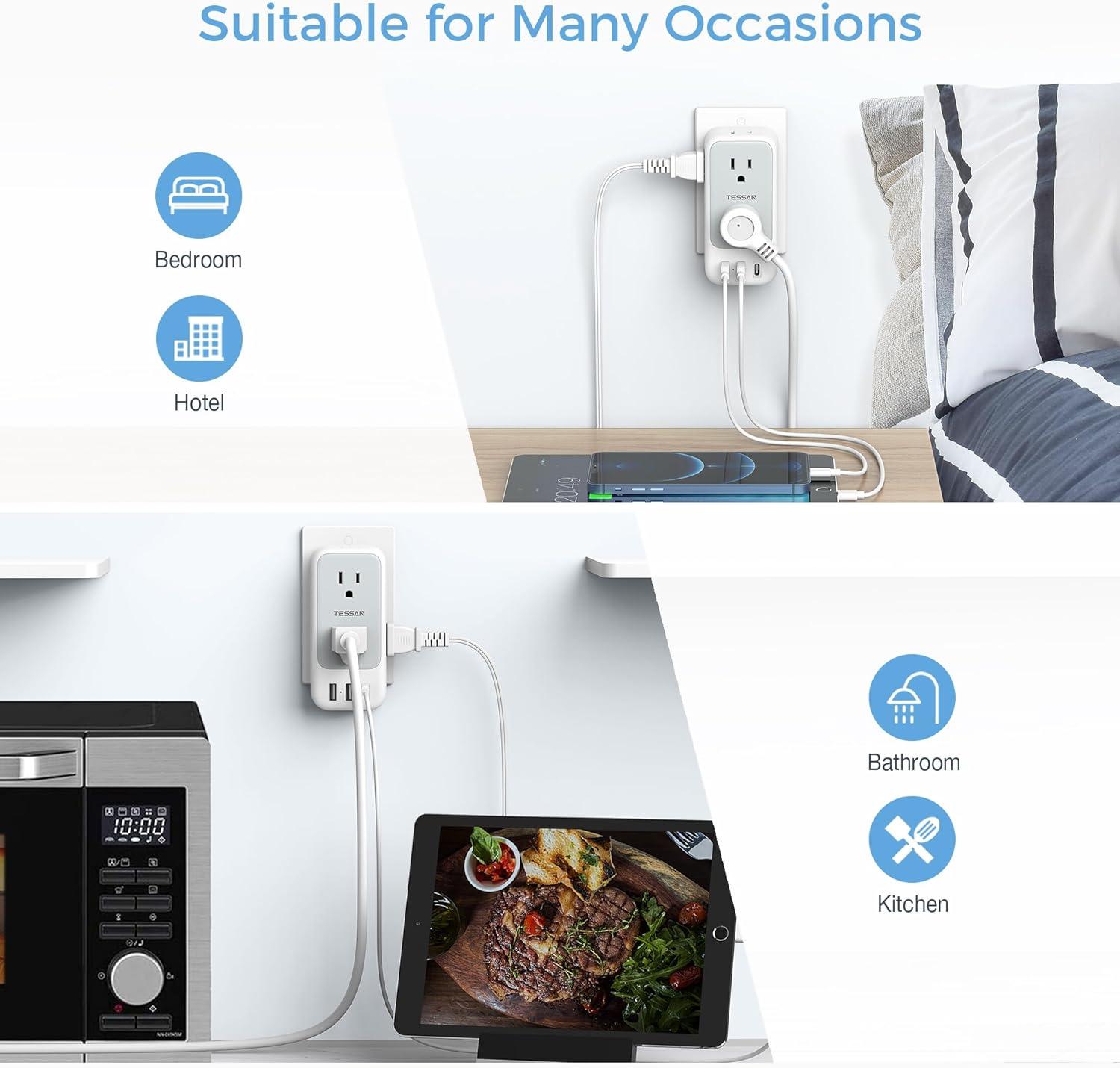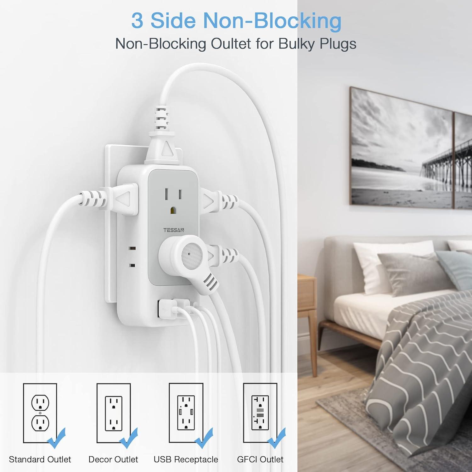 Applicable Wall Outlet Types: TESSAN Wall plugs with USB is compatible with standard receptacle, decor receptacle, USB receptacle, GFCI receptacle; Multi plug outlet is suitable for bedroom, bathroom, kitchen and college dorm room